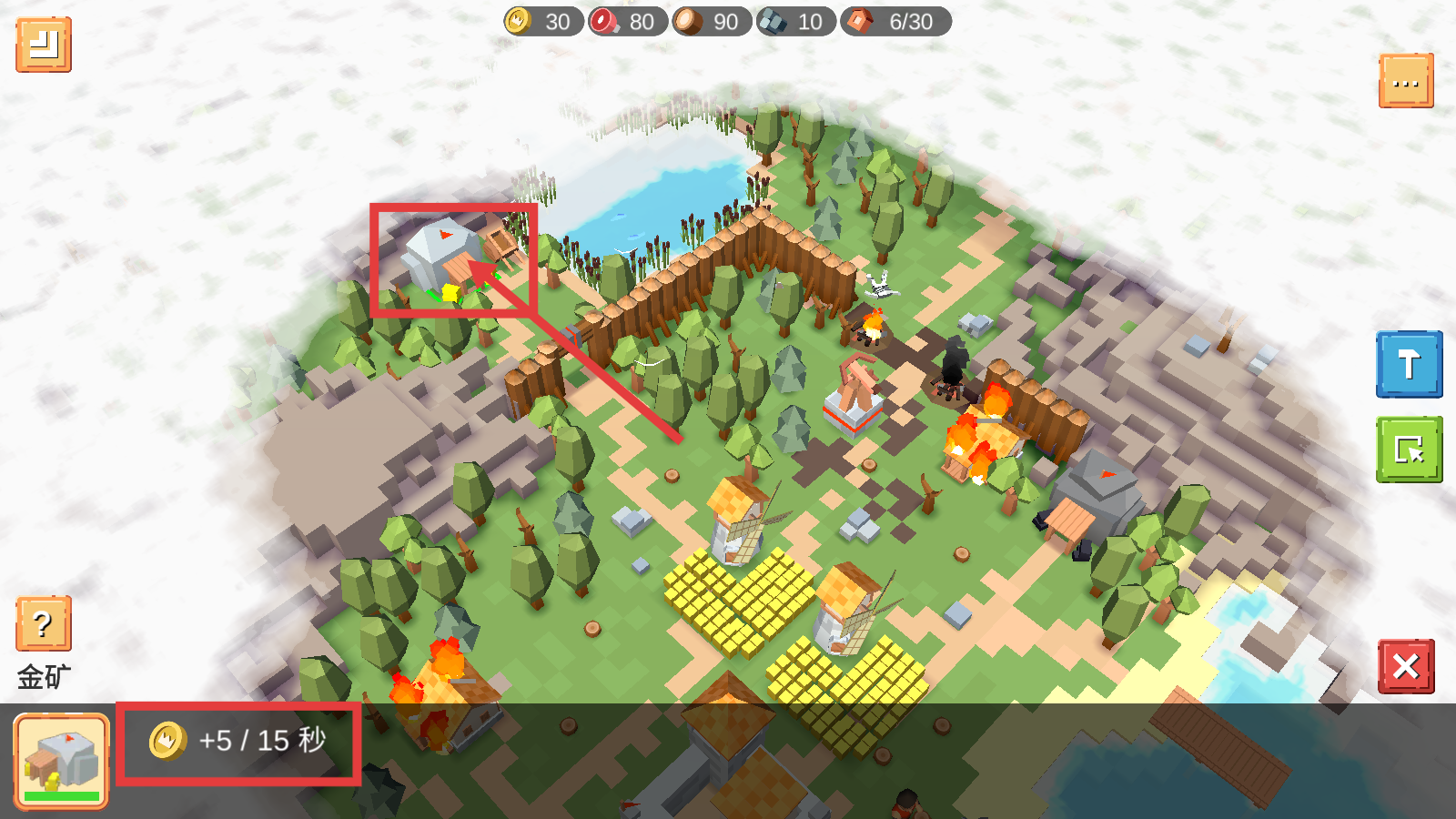 2、建造【金矿】,可每15秒获得【+5】金币,积累资源用于后续建筑和士兵招募。