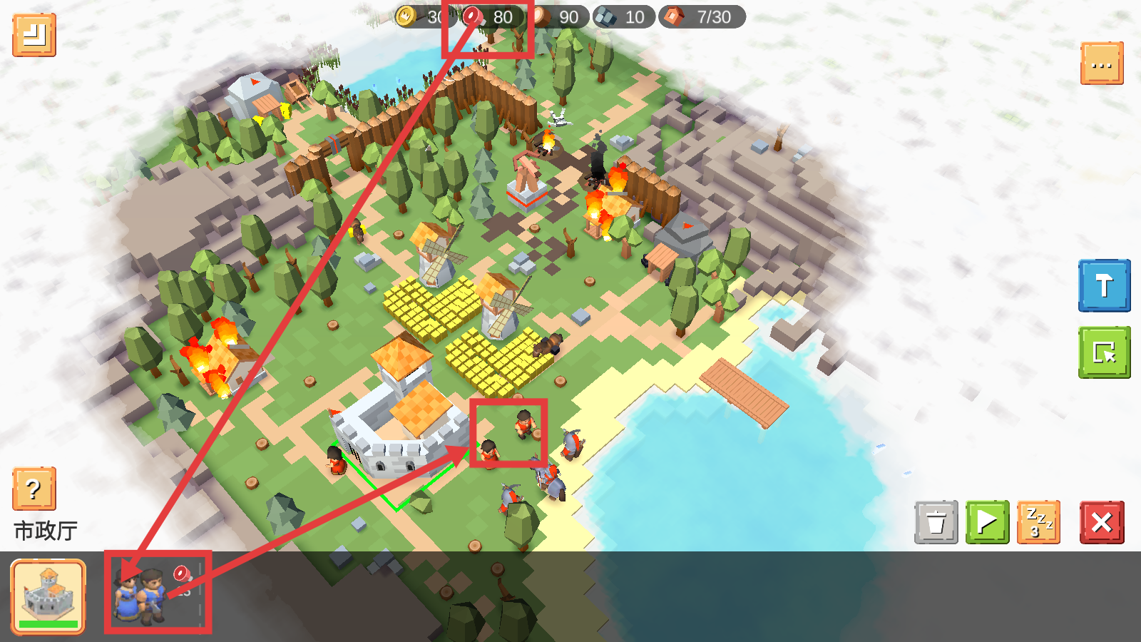 3、升级【市政厅】,提升人口上限(当前80),招募更多市民,为村庄发展提供人力支持。