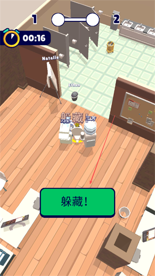 1、在场景中找到可躲藏的区域,点击躲藏!按钮,让角色隐藏起来,躲避追捕者。