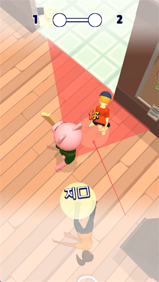 3、追捕者需进入视野范围红色区域发现并捕捉躲藏的玩家如橙色衣服角色。