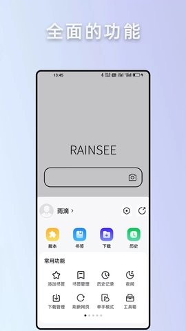 与雨见浏览器不同的是,RaIns取消了火狐/谷歌拓展的支持。精简了运行的框架,从而带来了更为流畅、简洁的使用尝试。智能播放器、油猴脚本、AI问答等大部分功能得以保留