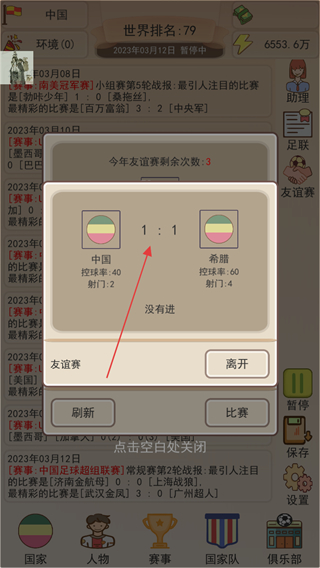 4、友谊赛结束后,查看比赛结果如1:1平局,积累赛事经验,提升球队世界排名。