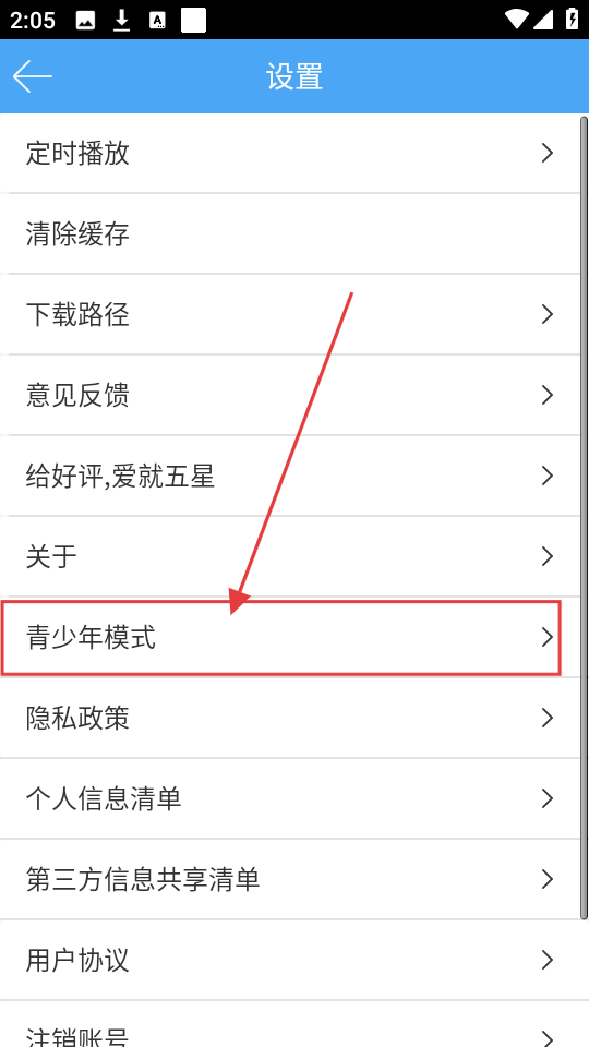 2、进入设置页面后,找到【青少年模式】选项,点击它就能进入相关设置界面啦。