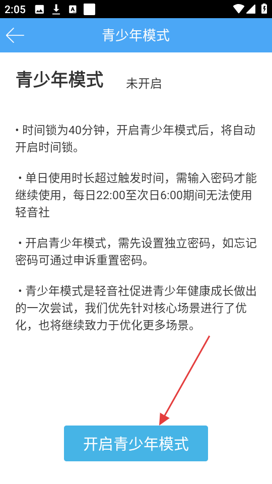 3、在青少年模式页面,能看到模式介绍,若要开启,点击【开启青少年模式】按钮即可哦。