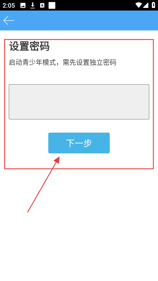 4、开启青少年模式需设置独立密码,在设置密码页面输入密码后,点击【下一步】继续操作就行啦。