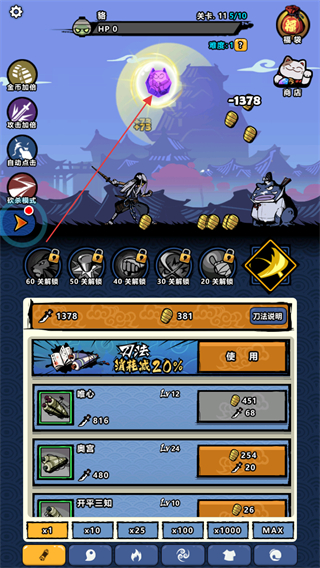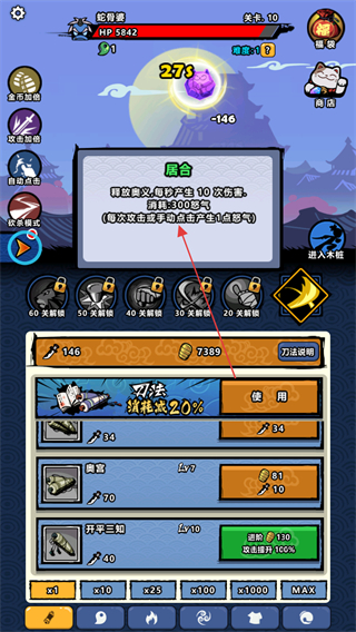 2、点击紫色妖怪进行攻击,击败妖怪可获得金币和经验,用于升级属性。