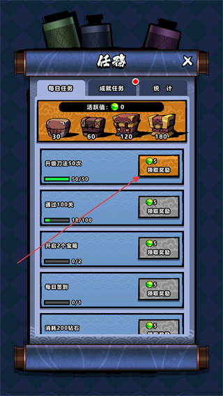 4、完成每日任务如挥刀万次50次,点击“领取奖励”获取资源,助力角色成长。