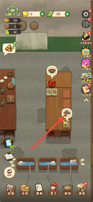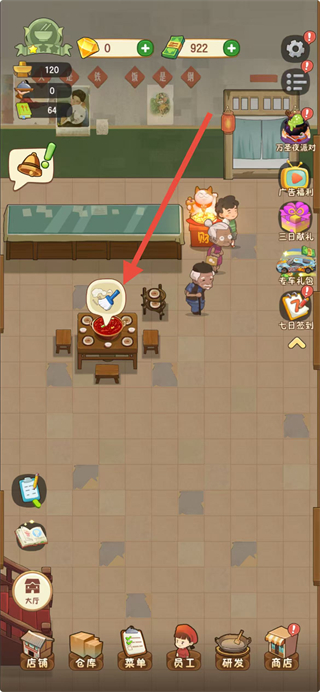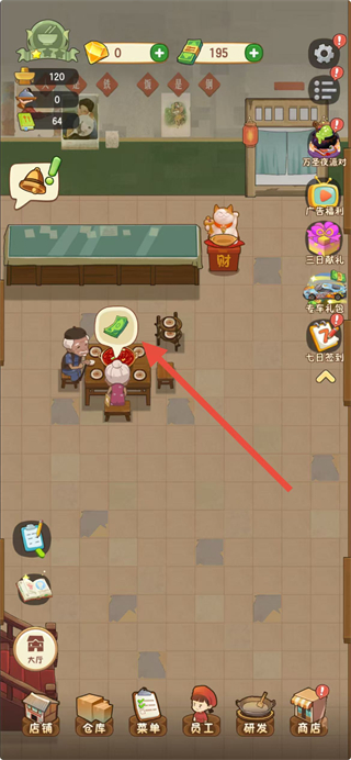 2、顾客用餐结束后会产生金币,点击金币即可收取,积累金币可用于升级店铺设施。