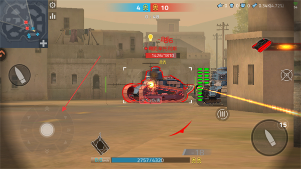 1、操控左侧方向键移动坦克,瞄准敌方坦克开火,利用地形躲避攻击,削减敌方血量。