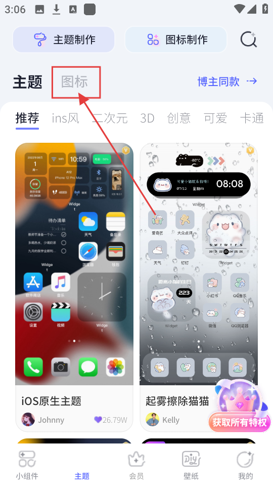 1、进入主题页面后,看到上方的【图标】选项,赶紧点击它,这样就能看到各种图标分类啦。