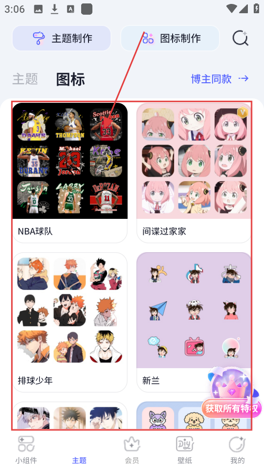 2、在图标分类里,有【NBA球队】【间谍过家家】等不同风格的图标包,选一个自己喜欢的点击进去。