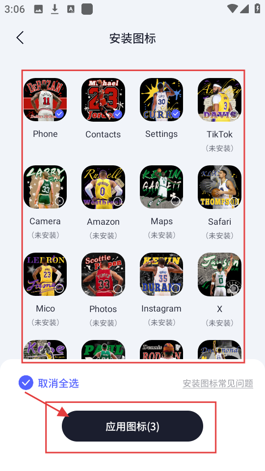 4、来到安装图标页面,挑选好要安装的图标,然后点击下方的【应用图标-(3)】按钮,就能完成安装啦。