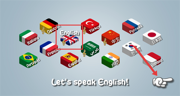 3、语言选择页面选择“English”,将游戏语言切换为英语。