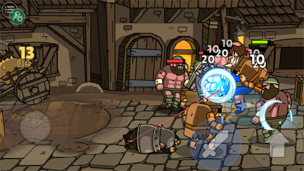 2、释放技能如蓝色光球,对多个敌人造成伤害如10、20点,达成连击如13连击。