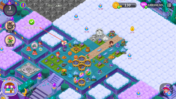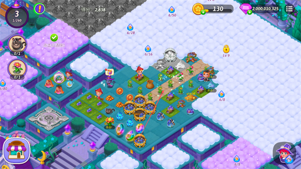 3、持续合并元素,生成新的物品和资源,推动游戏进程,提升得分。