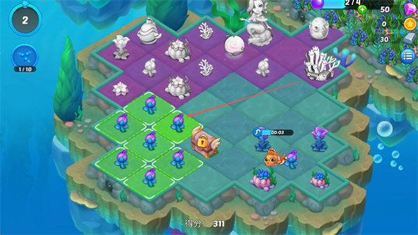 3、将相同的紫色植物进行合并,生成更高等级的植物,完成合并次数。
