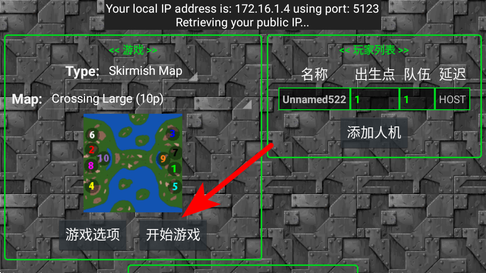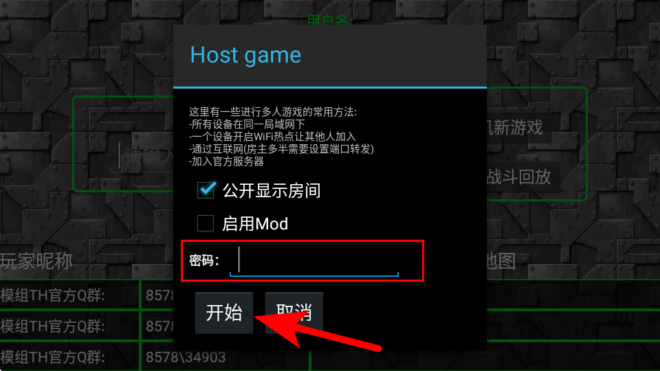 3、在弹出的Host game界面中,可根据需求设置密码,设置完成后点击开始,完成房间创建。