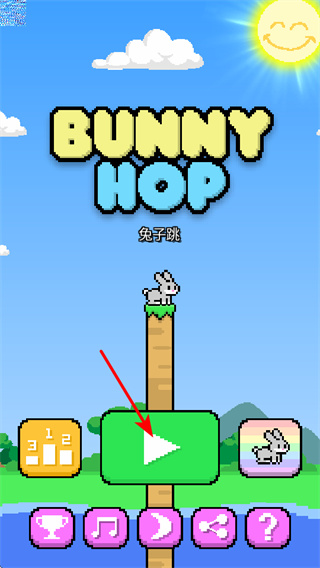 1、进入游戏界面后,点击绿色开始按钮,可开启兔子跳的跳跃冒险,这是进入游戏的关键操作,点击能展开兔子的跳跃挑战。