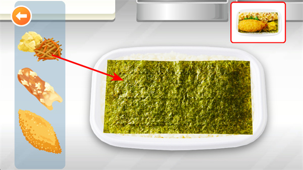 4、在组装便当环节,点击左侧的配菜如炸物、炒丝等,将其放置到铺有海苔的米饭上,完成便当的组装,做出完整海苔便当。