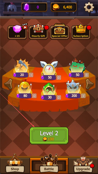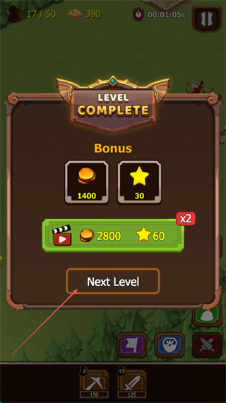 1、花费金币解锁Level2进入新关卡,可在商店升级镐头、时钟等道具增强战力。