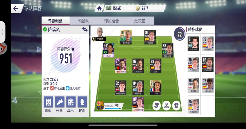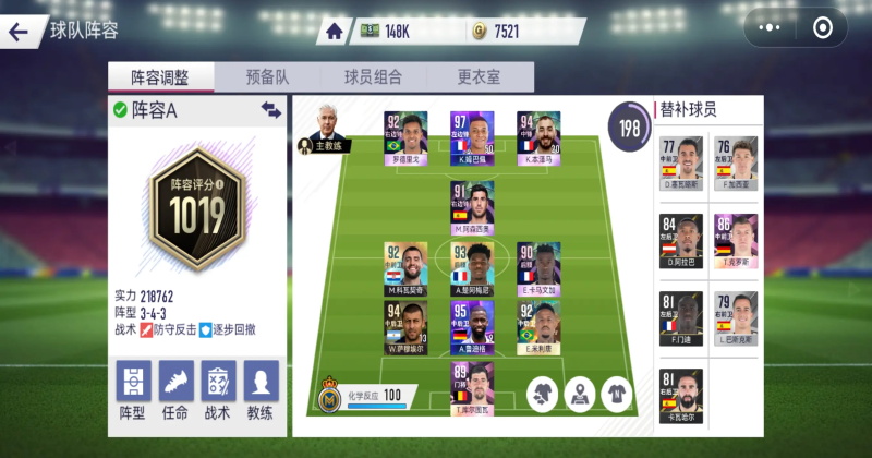 所以我这边给各位朋友一个前期百搭阵容,以8名90以下的球员卡+替补席凑出一个100化学的阵容,剩下三个主力位置可以上任意卡,来实现前期的战力最大化。