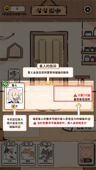 2、客人进入房间后,需满足其红色要求,若不满足客人会拒绝支付,满足则可提升客人愿意支付的猫猫币。
