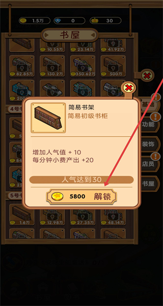 3、在弹出书架属性窗口时,可以点击消耗5800金币解锁。