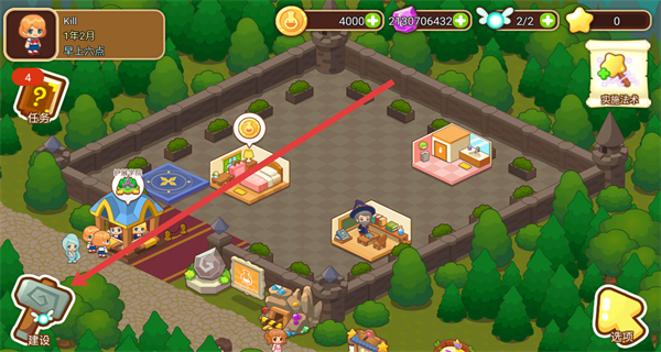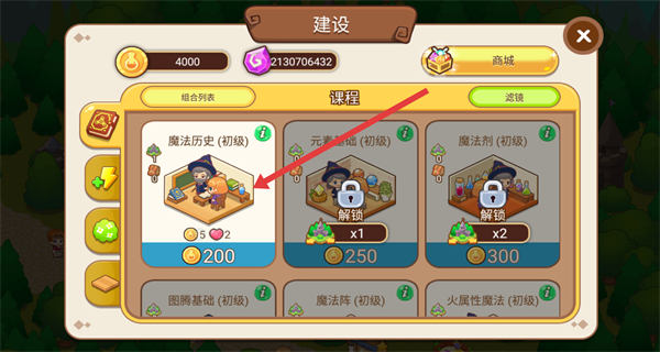 2、在建设页,选择魔法历史(初级)课程,消耗200金币解锁建造。
