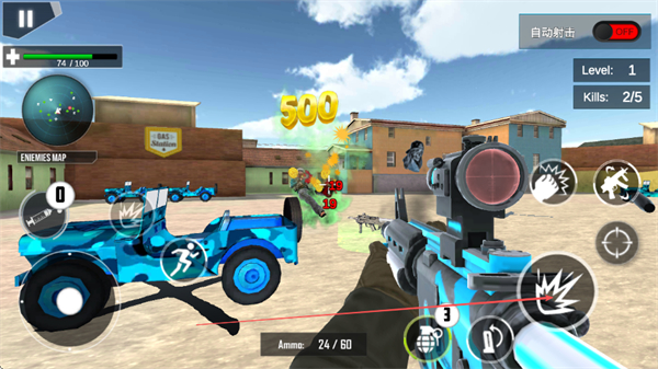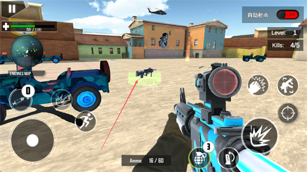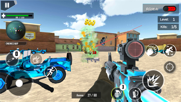 1、通过左侧虚拟摇杆控制移动,右侧瞄准射击,利用枪械瞄准敌方目标,精准射击消灭敌人。