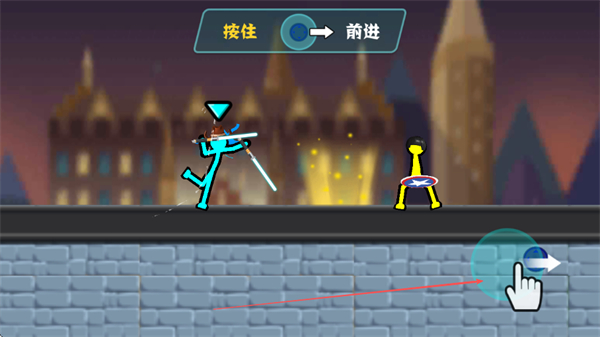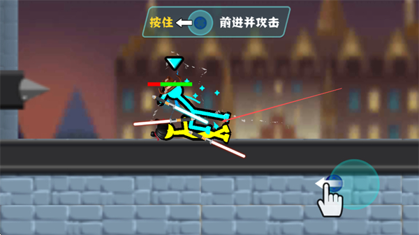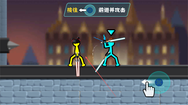 2、按住左侧方向按钮,可让火柴人前进并发起攻击,与敌方展开近战。