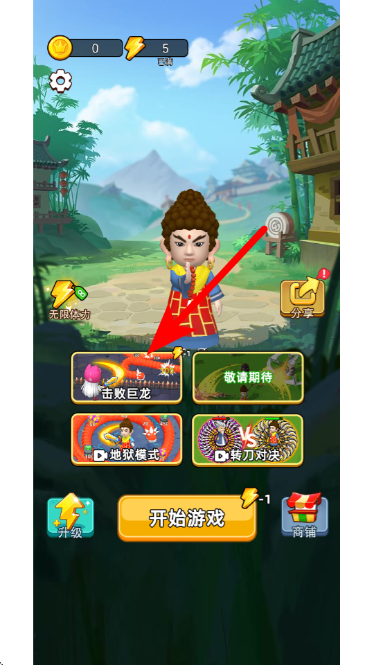 1、进入游戏界面后,点击击败巨龙模式,这是开启该特色关卡的入口,选择后即可进入巨龙挑战关卡。