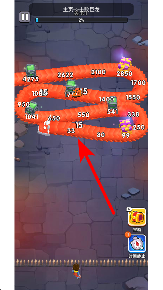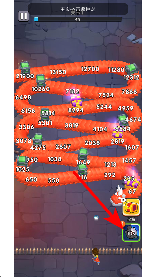 2、在击败巨龙关卡中,攻击巨龙的身体区域,通过持续攻击来推进关卡进度,逐步削减巨龙的生命值。