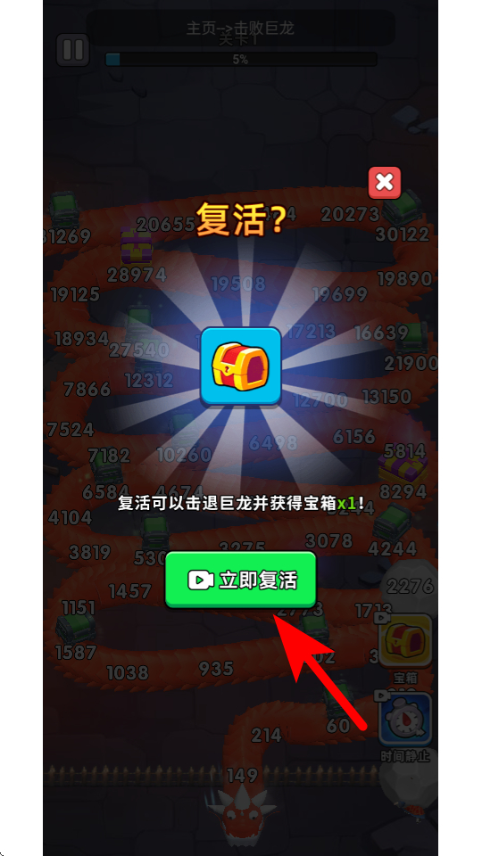 4、若是巨龙到达栅栏里则战斗失败,点击立即复活,复活后可击退巨龙并获得宝箱,继续参与关卡挑战。