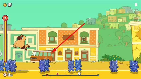 2、飞行中撞击软糖熊可获取金币与增益效果,助力飞得更远更快,点击屏幕让野牛撞击软糖熊可获得加速。