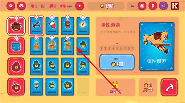 4、积累金币后可在道具界面购买升级,如弹性纜索能提升初始弹射力,还有各类道具可增强飞行能力,需根据需求优先升级关键道具。