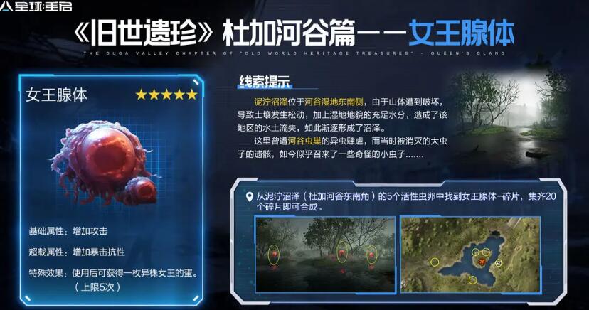 去到泥泞沼泽,在那里有着五个活性虫卵,可以获得女王腺体碎片,极其20个获得。