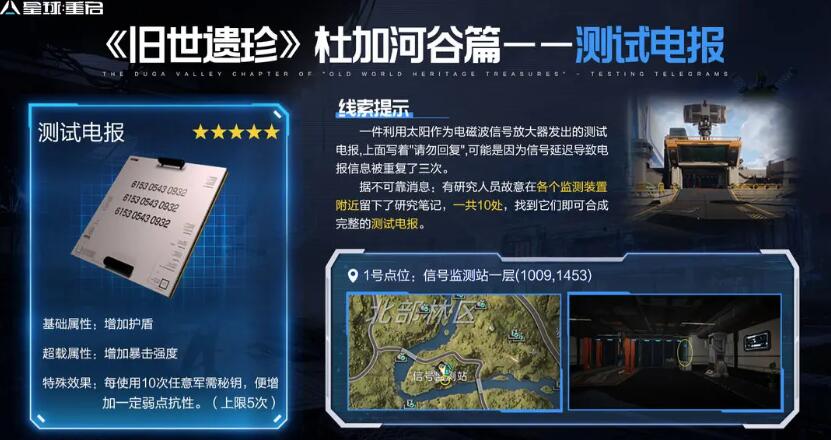 一共有着十个获取位置,当玩家全部找到后,即可合成完整的测试电报。