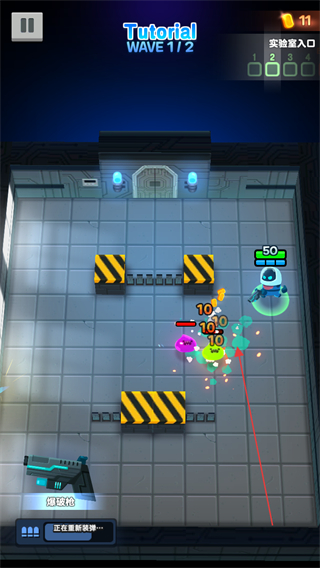 1、松开手让角色自动攻击敌人,利用爆裂枪持续输出,消灭实验室内的怪物。
