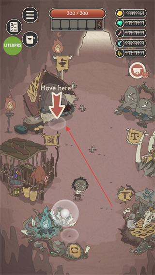 1、根据Movehere!提示,移动角色到指定区域,探索部落场景,解锁新建筑和功能。