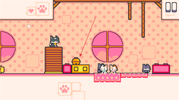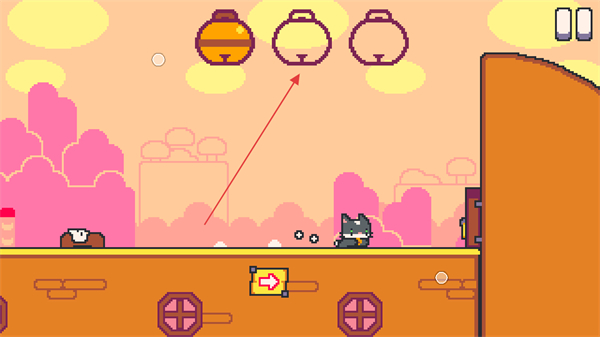 1、操控小猫移动,收集橙色铃铛道具,按照箭头提示推进关卡,注意场景中的互动元素。