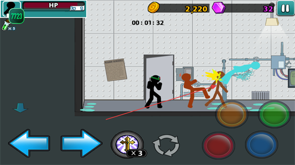 1、操控火柴人与橙色敌人战斗,利用攻击按钮发起连击,快速消灭敌人。