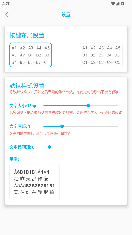 1、在该软件的浏览乐谱界面你可以看到底下有文本样式和背景样式调节功能,点击文本样式,可以调节文字大小,文字间距,文字行间距。