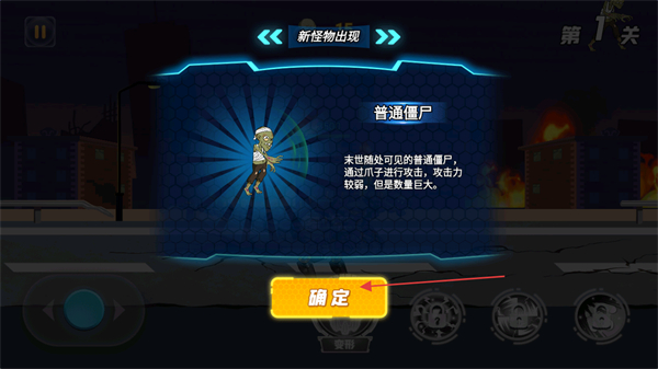 1、点击确定,了解普通僵尸的属性,其攻击力较弱但数量巨大,准备迎接战斗。