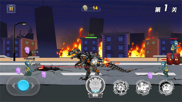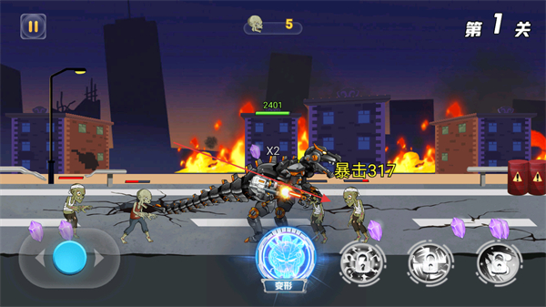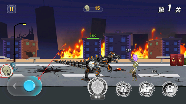 4、点击变形按钮,释放机甲技能,对僵尸造成大范围伤害,快速清理剩余敌人,推进关卡。