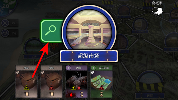 3、进入地点后,点击搜索图标,可触发搜索事件,出现搜索、凶鼠、设立总部等选项。