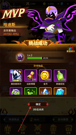 4、击败破坏神后,获得挑战成功,点击确定领取奖励,包括英雄经验、金币等,提升英雄战力继续挑战。