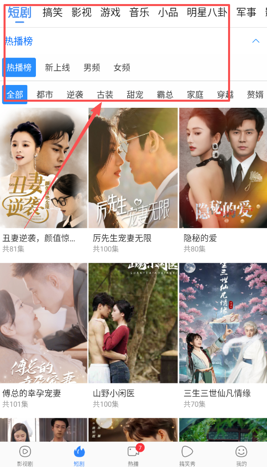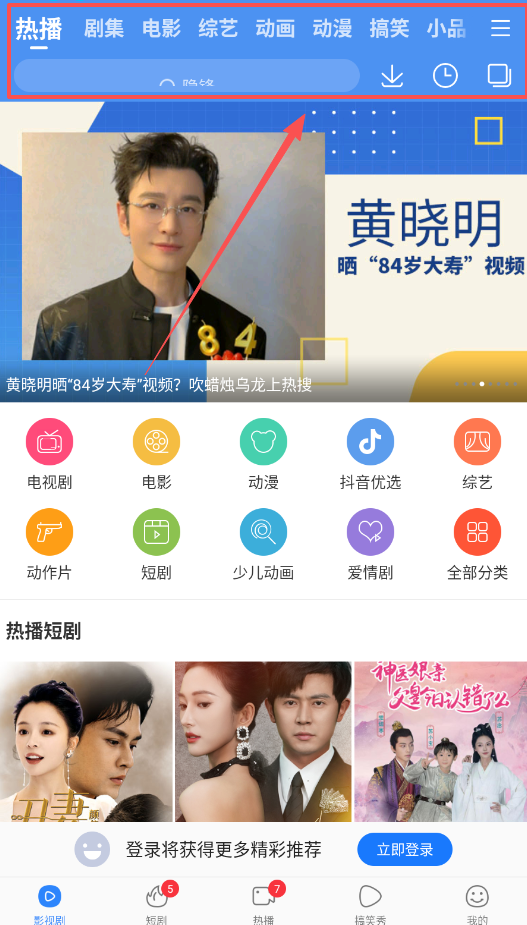 2、想看短剧或影视内容,可在首页选择看剧页签,上方有关注、推荐、短剧、坚屏、热点等分类标签供你筛选。