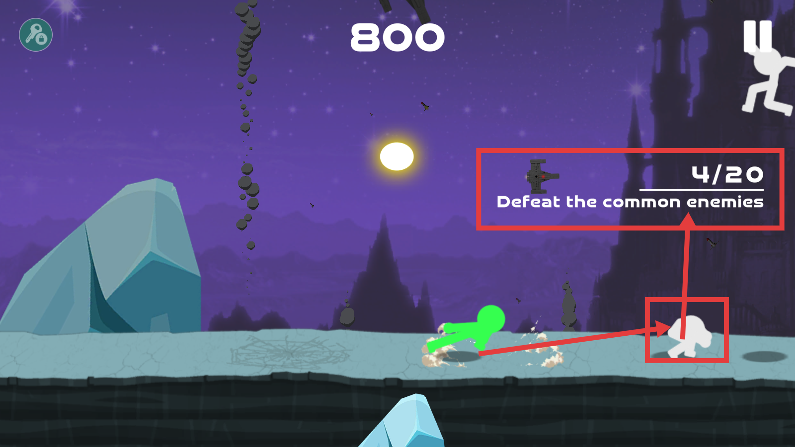 1、点击【TAPTOSTART】开启游戏,需完成三项任务:击败20个普通敌人、击败1个长矛boss、用炸弹击败1个普通敌人,同时挑战高分纪录。