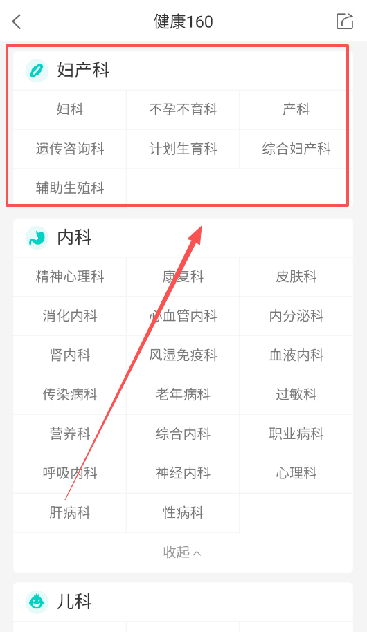 3、在科室选择页面,app清晰地列出了妇产科、内科、儿科等所有科室,方便你做出选择。
