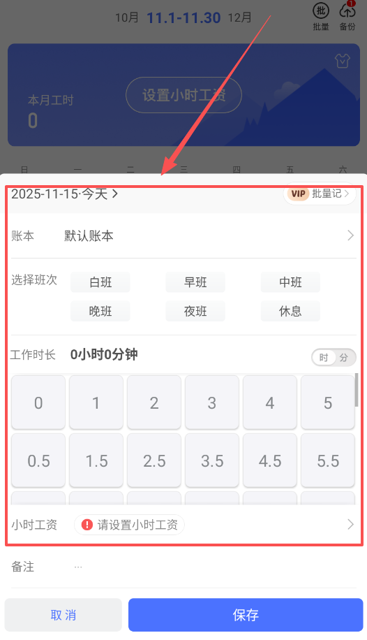 2、在记工时界面,你可以看到清晰的日历视图,点击选择适合的班次比如白班或晚班,最后别忘了填写备注并保存记录。